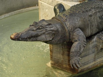 Ce dut donc être un jour de fête pour la cité nîmoise, lorsqu’en 1597 on apporta dans son sein pour la première fois un vrai crocodile venu des rivages du Nil. On lui assigna tout naturellement une place d’honneur. Écoutons ici encore l’historien Ménard :