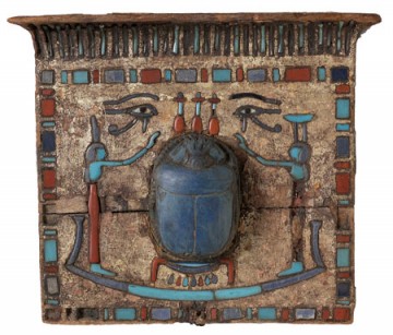 On commence par l’univers, dont les différents espaces communiquent entre eux : la terre pour les êtres vivants, le ciel pour les divinités et l’au-delà pour les défunts. La survie du monde dépend de leur collaboration. Dans cette section, dominée par le jaune du Soleil, les petits objets signifient autant que de grandes stèles : par exemple, ce bijou, en forme de chapelle, de bois doré incrusté de verre, de faïence et de lapis, représentant l’astre qui se meut à travers le ciel avant de traverser le monde inférieur, à bord d’une barque, le véhicule fondamental de l’univers égyptien.