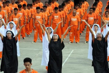 La video est revenue et j’ai pu la visionner… Belle chorégraphie pour des amateurs… Est-ce une femme ou un homme en bleu ? Si c’est une femme, c’est assez étonnant qu’elle ait été autorisée à danser avec des détenus masculins… Cool les Philippins ? Il y a aussi plusieurs femmes sur la photo (des soeurs ?)