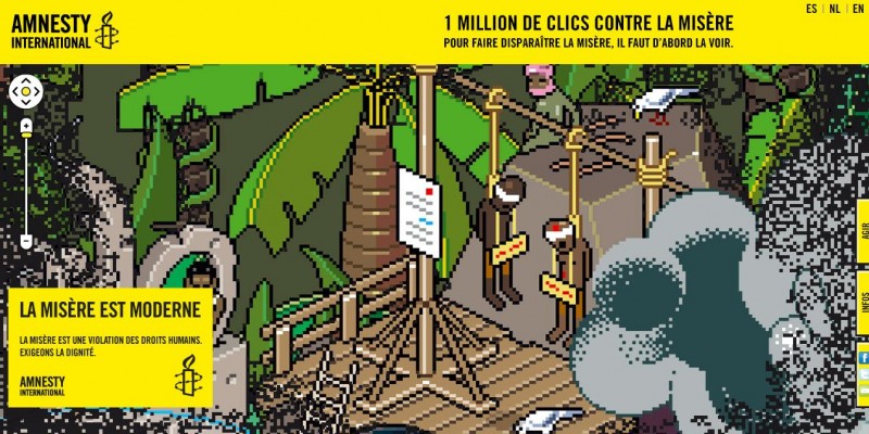 C’est le sens du site Internet créé à cet effet, le « 1 million de clics contre la misère », qui masque le pixel art et invite les internautes à cliquer sur l’écran noir pour, petit à petit, pixel par pixel, faire apparaître les scènes les plus « emblématiques » ou « caricaturales » de violations des droits humains. Ces dizaines de scènes composent l’image numérique du pixel art. Au fur et à mesure de votre progression, différentes informations et actions vous sont proposées et vous êtes renvoyés vers notre site Internet principal.