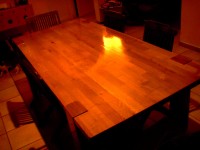 En rentrant hier du boulot, surprise ! La grande table en chêne était luisante, comme neuve. Anti l’avait passée à l’huile de lin. Et à la cuisine, pareil : le plan de travail était lui aussi entièrement huilé de frais. Tout ce qui, normalement, se trouvait dessus était posé par terre ou sur la table de cuisson (éteinte !).