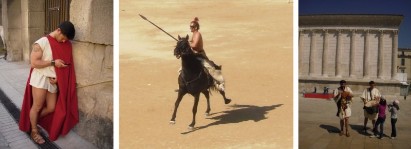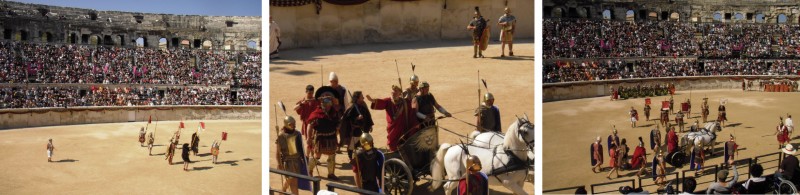 Certaines des photos dans les Arènes sont d’Anti : le cavalier sur la première série, Hadrien sur son char au milieu de la seconde, la pomme coupée en deux sur la troisième, les chars qui se croisent sur la quatrième et l’arrivée du méchant à la masse au milieu de la dernière. Les autres sont de moi.