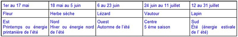 Dans le calendrier des saisons, le Lézard est la force automnale, donc tempérée, au cœur de l’été : sa partie ouest. Il se déploie du 6 au 23 juin, avant le solstice.