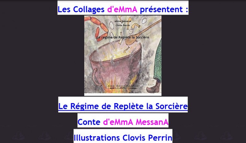Le Régime de Replète la Sorcière, Texte eMmA MessanA, illustrations Clovis Perrin, Antipode – Éditions du Puits de Roulle, 2010. 12 €. Pour celles et ceux qui souhaitent s’octroyer 33 pages de bonheur et/ou les offrir, contacter l’auteur : emmaconte@club.fr