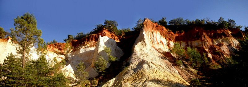 Il s’agit d’anciennes exploitations d’ocre – pas la couleur, mais le minerai naturel qui lui a donné son nom. L’ocre est une roche composée d’argile colorée par divers pigments minéraux dérivés du fer. Les ocres peuvent aller du jaune au rouge profond et ils servaient de colorants dès la préhistoire – on en voit en particulier à Lascaux..