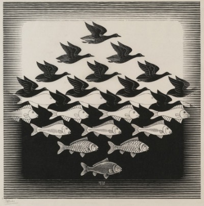 Vous avez sûrement déjà vu des tableaux d’Escher – pas Stephan Eicher, MC Escher. Il en a fait un certain nombre basés sur les symétries, comme celui-ci par exemple, où des oiseaux se transforment graduellement en poissons :
