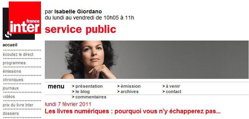 Lors de l’émission Service public d’Isabelle Giordano sur France Inter consacrée il y a quelques jours aux livres numériques, un auditeur est intervenu pour donner son opinion et a cité mon nom parmi ses auteurs favoris de livres diffusés par téléchargements.