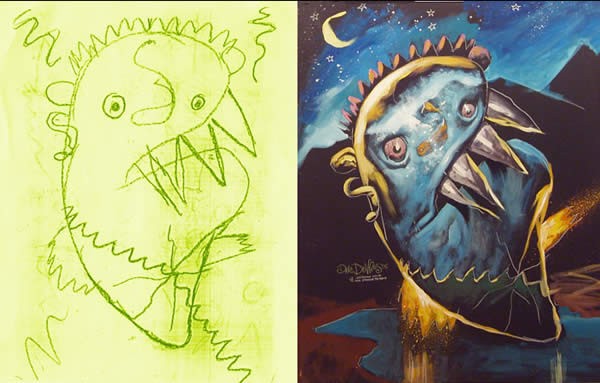 Dans ma carrière d’illustrateur, surtout dans les magazines de bandes dessinées et les marchés de jeu vidéo, je dessine et peins sans référence, inventant souvent la lumière, l’ombre et la texture pour rendre les gens et les scènes imaginaires. Cette technique me permet de visualiser des idées simples que beaucoup de personnes peuvent saisir. Le but de l’illustration a toujours été la communication. Un enfant, cependant, ignore l’idée de communication de masse en créant des images seulement de son avis. Souvent, un parent doit demander à l’enfant de décrire ce le jeune artiste est en train de dessiner exactement.