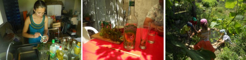 Le temps s’écoule à l’ombre d’une vigne vierge en tonnelle qui complète un petit préau. Il fait très chaud même à l’ombre mais l’appétit va bon train et les histoires qu’on se raconte, aussi.