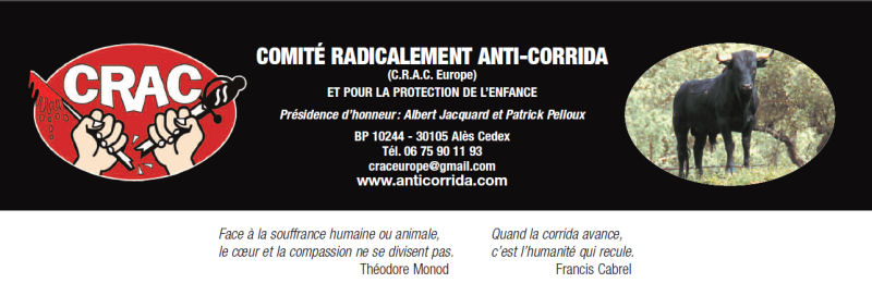 J’en profite pour vous faire part de notre inquiétude et de notre déception, ainsi que de celles de nos militants, quant à la venue prochaine de Marcel Rufo à France Inter en qualité de chroniqueur, comme en a déjà fait part Thierry Hély, porte-parole de la FLAC, à Philippe Val, membre du comité d’honneur de cette Fédération. Ce pédopsychiatre procorrida, qui ne manque jamais de clamer son afición, vante régulièrement les « bienfaits » de la corrida sur les enfants… Au CRAC Europe, nous luttons également contre les écoles taurines, qui apprennent à des enfants de dix ans à tuer des veaux.