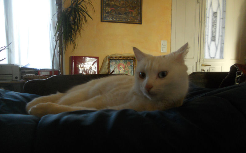 Grande surprise hier en rentrant de l’A.Gle, Véro et moi nous n’en revenions pas : mon Charlot SDF, qui ressemble beaucoup au vôtre, était sagement couché sur mon lit. Il a passé la nuit sur le fauteuil, il y est encore. Tant mieux, c’est bien la première fois, d’habitude il se contente de venir manger et repartir. Avec ce froid, je suis ravie de sa décision. S’il prend cette habitude, je pourrai enfin l’emmener chez le véto pour la castration.