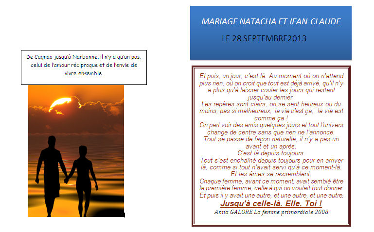 Les vraies et belles histoires d’amour sont comme des évidences. Parce que c’était toi, parce que c’était moi. Je souhaite tout les bonheurs du monde à Jean-Claude et Natacha.