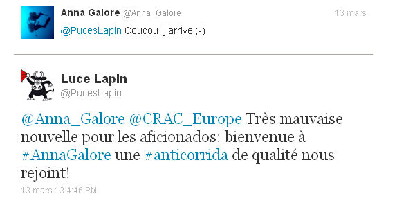 Mais elle insiste. Le but n’est pas que je me serve de Twitter pour raconter ma vie mais pour en faire une caisse de résonance à chaque fois que je veux rendre mes notes anti-corrida – ou cause animale en général – plus visibles.
