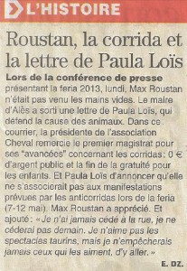 Paula Loïs avait protesté à juste titre, en mai 2012, contre la venue à Alès de Rui Fernandez, un rejoneador (torero à cheval) qui s’était marré lorsque son cheval avait été éventré par un taureau à Séville. Elle avait rencontré le maire en compagnie de la présidente d’une autre association dont le nom m’échappe.