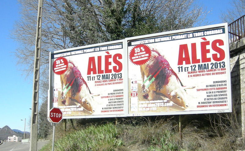 Voici un réjouissant florilège d’affiches appelant à venir en masse manifester contre la corrida à Alès les 11 et 12 mai prochain, pendant la féria. Les premières sont des panneaux publicitaires officiels 4 x 3, une vingtaine d’entre eux ont été loués par le CRAC Europe pour une durée de trois semaines dans la ville d’Alès.