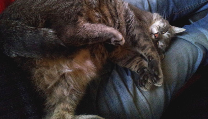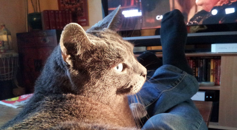 De façon générale, les chats adorent s’allonger sur les jambes tendues. Lorsqu’on regarde la télé le soir, c’est à qui viendra annexer le premier ces places de choix : mes jambes et celles d’Anti. Il n’est pas rare qu’ensuite il y en ait un ou deux de plus qui viennent s’affaler là où ils peuvent sur nous. Inutile de dire que, dans ces cas-là, on sombre rapidement dans une douce somnolence même si le programme est captivant.
