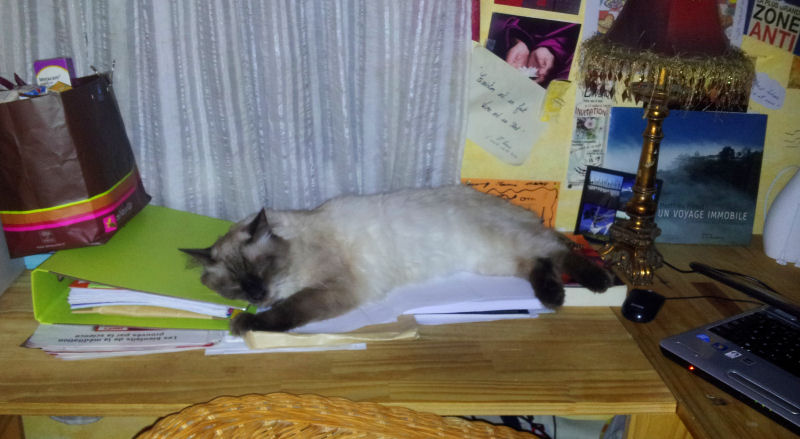 Parmi eux, il en est un qui est, ces temps-ci, mon copain de sieste attitré : c’est Gus. S’il me repère en train de m’allonger sur le canapé, voire déjà en route pour le pays des rêves, il me rejoint et vient se pelotonner contre moi ou, si ma position le permet, sur mes jambes.