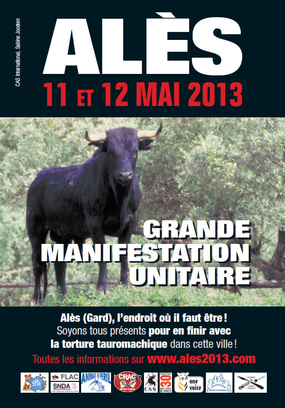 Les 11 et 12 mai 2013, se tiendra à Alès le plus grand rassemblement anticorrida jamais organisé en France : trois manifestations en deux jours, des milliers de manifestants attendus, un site internet dédié à l’événement www.ales2013.com mieux référencé que celui de la mairie d’Alès ; sur ce site, toutes les informations pour s’organiser : hébergement chez l’habitant, covoiturage, des départs en bus avec 33 villes françaises desservies, un bus de 55 militants de Barcelone, d’autres de Belgique, du Luxembourg ou d’Italie.