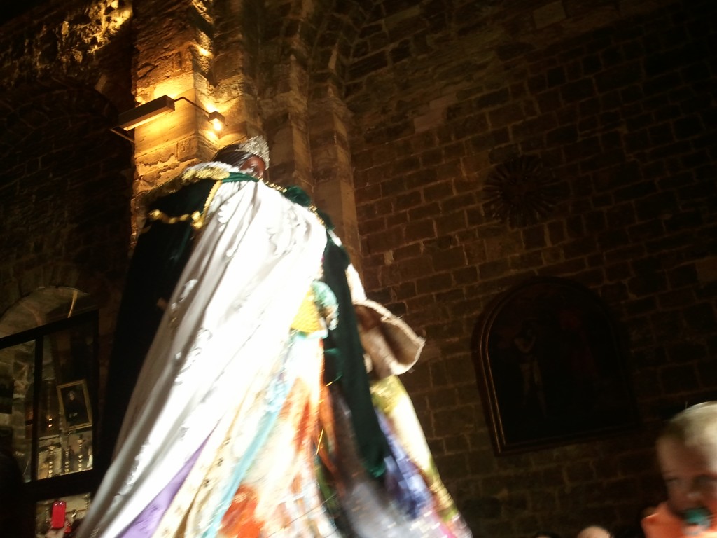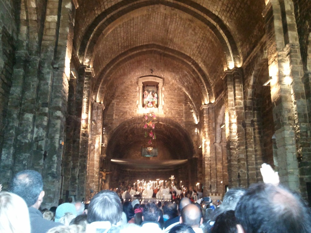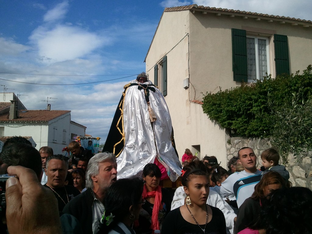 Le jour suivant, soit le 24 mai (et jour dédié à Sara pour les Gitans), nous sommes allés aux Saintes-Maries-de-La-Mer et avons vécu un peu son pèlerinage. Nous avons ainsi assisté à la descente des châsses dans l’église comble ; les personnes présentes étaient absorbées, n’ayant qu’un seul regard vers la haute chapelle, se serrant les uns les autres le plus possible et se poussant encore plus pour laisser entrer les porte-bannières et les divers officiants venus de toute la région.