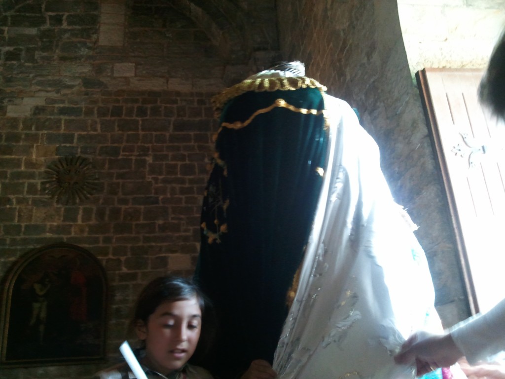 En revenant sur le parvis, je me suis trouvée isolée dans la partie vide au-delà des barrières, seule, face à Manitas de Plata, toujours présent en ce lieu sacré depuis des années de pèlerinage. Je lui ai envoyé des pensées d’affection puis il fut emmené dans la zone protégée. Je n’ai pas eu le temps de partir, les chevaux camarguais arrivaient déjà et je dus me plaquer contre les barrières pour éviter tout écart des montures retenues avec grande maîtrise par les gardians. J’ai pu toutefois me faufiler entre les pèlerins qui entraient sur l’aire, portant croix de fleurs et bannières.