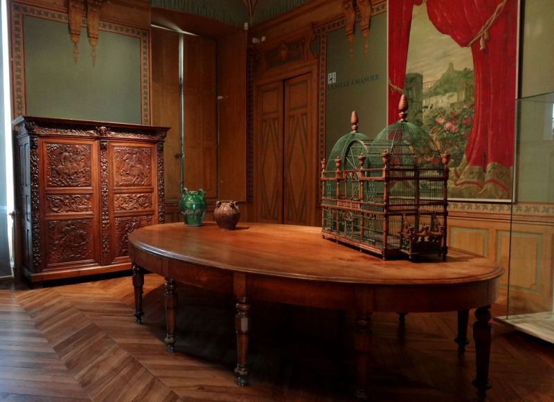 De l’autre côté, seule réussite à mon avis, on peut admirer une superbe salle à manger reconstituée, telle qu’elle devait exister en ces lieux il y a un siècle ou deux. Au pied d’un grand escalier d’aspect peu soigné trône un billard imposant. Le long des marches puis au premier, quelques grosses armoires ouvragées, quelques bibelots. Fin de la visite.