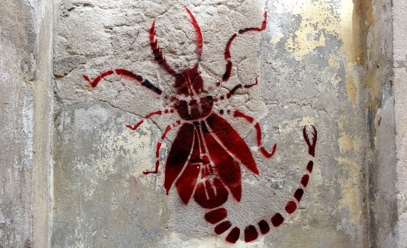 Nous avons poussé jusque chez Hélène qui habite depuis peu derrière la Poste. Son appartement est encore en plein travaux, ce qui n’est pas pour déplaire à ses minous. Sur le mur de sa façade, une drôle de bestiole d’un autre monde était peinte en pochoir. Encore un pas de côté, vers l’étrange et l’inattendu.