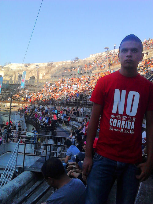 Samedi, lors d’un autre concert aux arènes, Houssam, sympathisant actif du CRAC Europe, a décidé de récidiver à sa manière, en tant que simple individu, juste parce que l’existence des corridas l’insupporte, que ce soit à Nîmes ou ailleurs. Il a tenu à porter ce soir-là le désormais fameux t-shirt rouge No Corrida, celui qui je lui ai offert à Alès le 12 mai dernier.