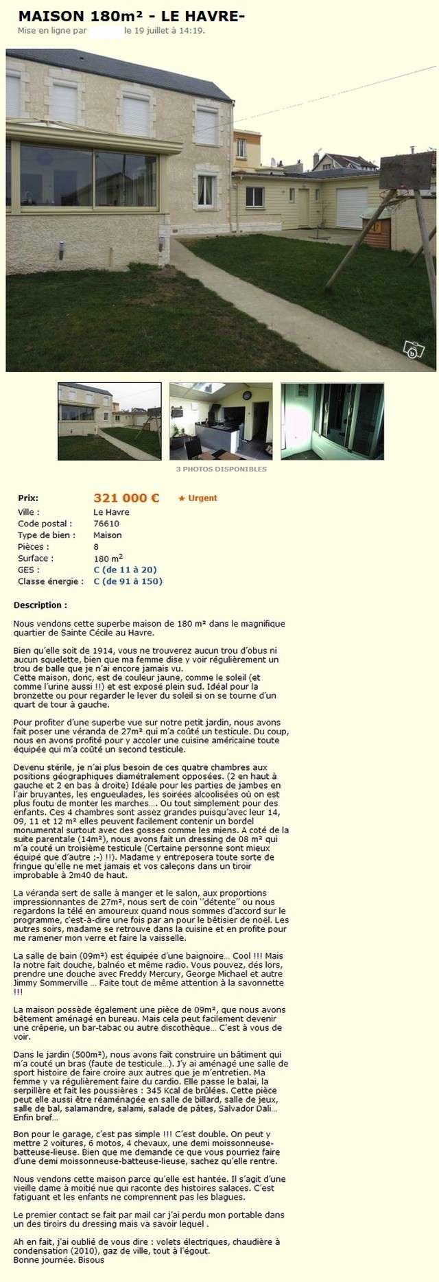 Vous connaissez peut-être le site du boncoin.fr soit parce qu’on peut faire d’excellentes bonnes affaires, soit parce qu’on y trouve de temps à autre des annonces drôles, telles celles de Monsieur Dauteuille qui ont fait le buzz il y a quelques années. Le Bon Coin, ce sont donc des milliers de petites annonces en tout genre. Récemment, l’une d’entre elles est même devenue une pub. Mais sur le site on peut aussi trouver de petites perles, des annonces insolites et amusantes qui nous distraient. Fautes d’orthographe, objets peu banals ou vendeurs peu honnêtes, certaines annonces ont le mérite de nous faire rire. Ainsi on a pu découvrir une annonce pour un portable déjà volé, une tronçonneuse qui coupe des arabes et non des arbres, un tapis de souris en vrai peau de souris ou encore un parachute qui a provoqué la mort de celui qui l’a porté le premier. Un compte Twitter créé jeudi dernier compile le meilleur de ces pires annonces. Intitulé Perles du Bon Coin, il permet de retrouver chaque jour de nouvelles pépites dans sa Tweet List. Il compte déjà plus de 11 800 abonnés ! Aujourd’hui, c’est l’annonce d’une maison à vendre au Havre qui fait le tour de la toile, et pour cause !