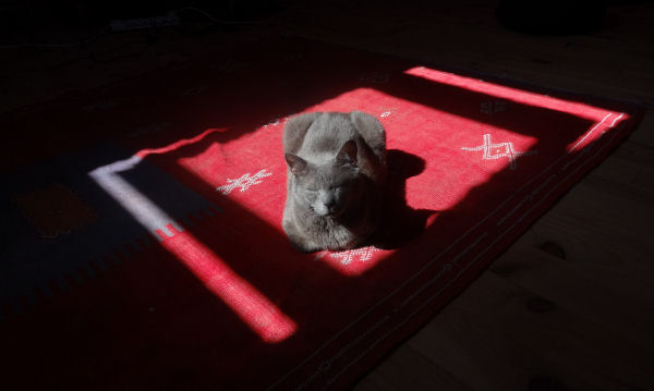 Le chat, c’est Padmé. Le tapis volant, il est entièrement fait de lumière, c’est dire si c’est magique. Je vous explique. Hier dans la matinée, alors que je passais voir Anti dans son bureau qui est dans les combles, je vois Padmé qui se prélasse sur un tapis à ses pieds. Mais pas n’importe où : juste là où le soleil découpe sur le plancher un cadre lumineux à travers le Velux.
