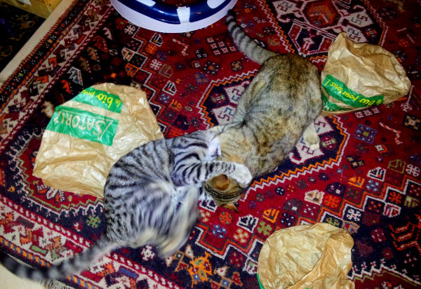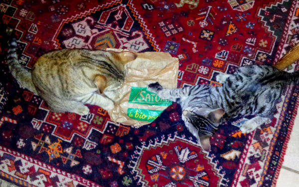 Vous avez sûrement déjà vu des enfants à qui on offre un beau cadeau et qui jouent beaucoup plus avec l’emballage qu’avec ce qu’il contient. Hé bien, les chats, c’est pareil. Rien de mieux pour s’amuser qu’une boulette de papier alu ou, comme chez nous ces jours-ci, des sachets qui ont servi à faire les courses.