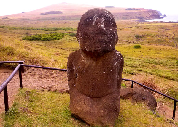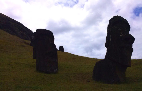 Voici la carrière des moai qui montre le travail depuis l’excavation dans la roche ; les habitants faisaient ensuite glisser les blocs le long de la pente.