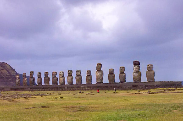 Le premier endroit que je visitai fut le lieu sacré et cérémoniel des sept explorateurs ou messagers. Les colossales statues sont placées sur un « ahu » (plateforme) qui a une présentation de navire. Elles sont les seules à regarder vers la Polynésie (lieu d’où les premiers habitants sont venus). Plus précisément, elles sont dirigées vers une île « Hiva » qui allait s’effondrer. Tous les autres moai regardent vers l’intérieur de l’île en signe de protection.