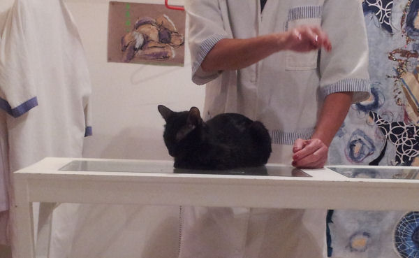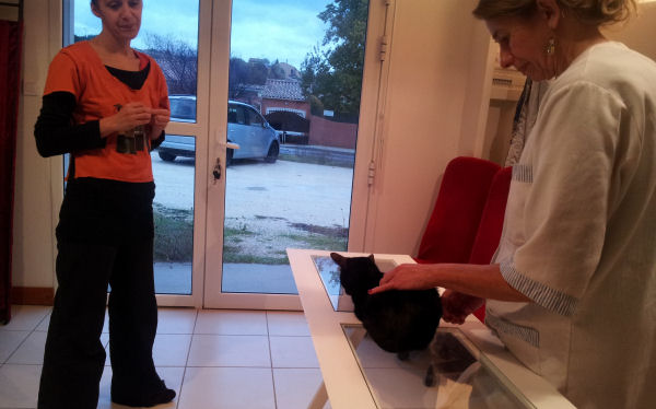 Aussi, hier, nous l’avons emmené chez une ostéopathe que Christophe nous a recommandée. Elle est également vétérinaire et s’est occupée d’une clinique pendant plusieurs années avant de s’installer à son compte. Elle a un contact impressionnant : Amon n’a pas bougé de la table en verre sur laquelle elle l’a posé pendant toute la durée des manipulations – une bonne demi-heure.