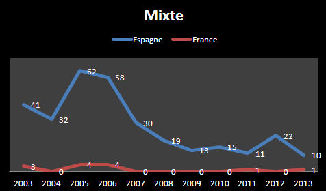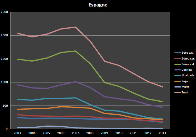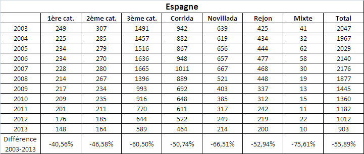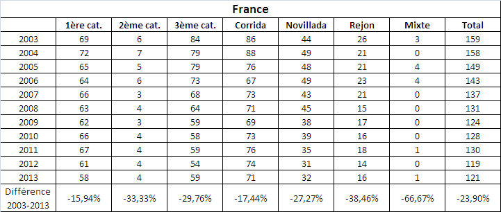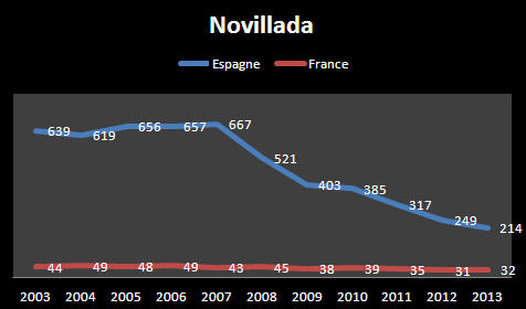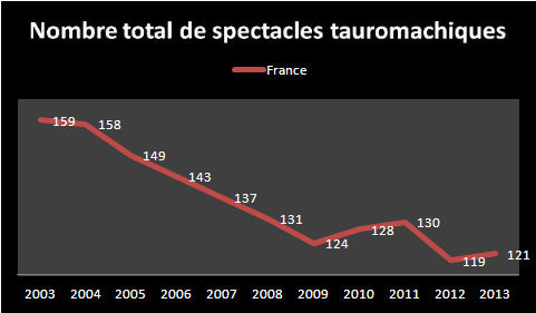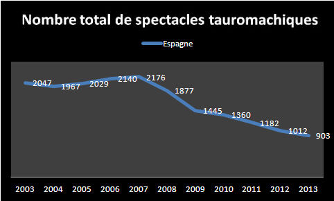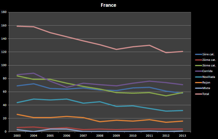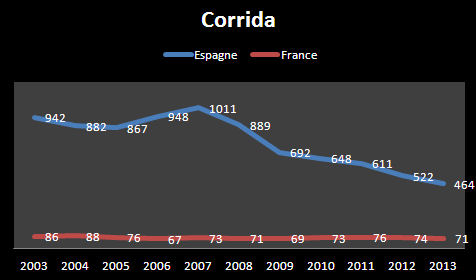 Sur la base des chiffres officiels publiés par diverses organisations taurines, telles que Mundotoro en Espagne et la revue Toros en France, Mario Valenza, président de la BACM, et Floriane ont réalisé un superbe travail de compilation montrant l’érosion continue des spectacles tauromachiques en France et en Espagne pour la période 2003-2013.
