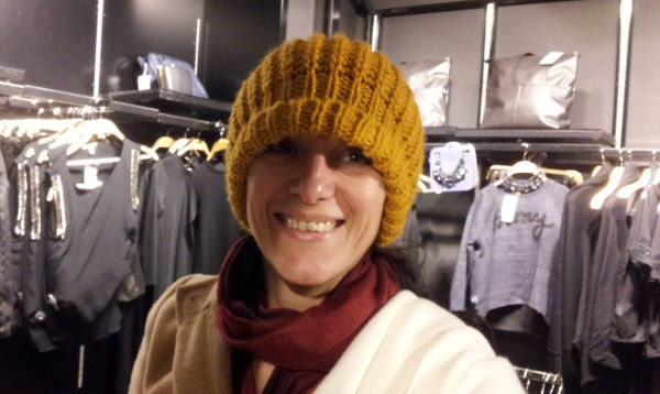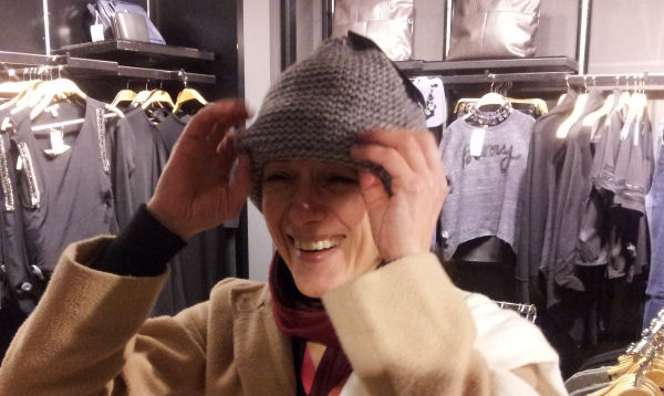 Après notre éphémère passage à vide, nous avons décidé de profiter d’un peu de temps libre hier après-midi pour aller flâner dans les rues de la ville et profiter des soldes. Le centre était très animé, avec une braderie dans l’une des artères principales de la ville. Mais pour commencer, nous avons fait quelques boutiques. Et là, comme à son habitude, Anti a voulu essayer tous les chapeaux qu’elle voyait. La preuve…
