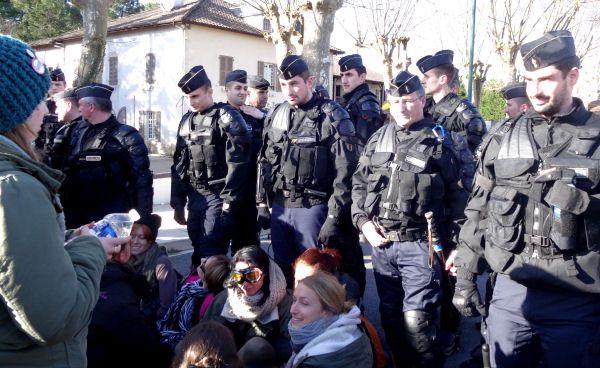Le matin du jour J, nouveau coup de panique : des manifestants avaient été mis en garde à vue dès leur arrivée au village, dont l’un, tenez-vous bien, parce qu’il avait juste un sifflet sur lui. Renseignement pris, il avait surtout des fumigènes et une bombe lacrymogène, ce qui est en effet illégal pour un particulier qui se promène dans la rue. Un second avait été embarqué après un contrôle d’identité, car « en lien avec une enquête sur des incidents en 2013 autour d’une action anti-corrida à Rion-des-Landes« . Sinon, je vous le confirme, le port de sifflet sur la voie publique n’est toujours pas réprimé par le code pénal dans notre pays.
