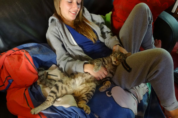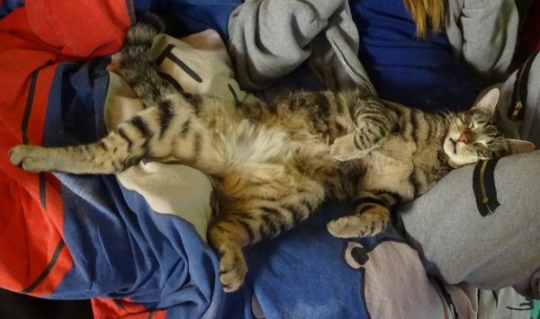 A la demande générale de tous ceux qui, parmi vous, aiment nos notes sur les chats – et ça fait du monde – je vais vous offrir ce matin encore une occasion de fondre un peu plus grâce à nos minous. C’était hier soir, Gwlad regardait la télé avec Houssam et Pierrot n’a pas résisté à cette occasion parfaite d’avoir un méga câlin. Remarquez, dans l’après-midi, c’était moi qui regardais la télé et là, c’était Morphée qui profitait à fond du doux plaisir d’être caressé en s’endormant.