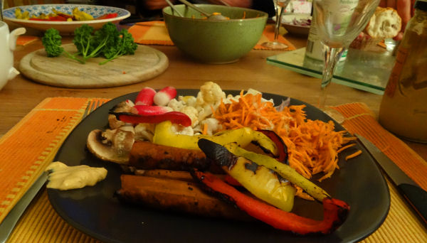 C’est là que la pluie a commencé à tomber, à toutes petites gouttes au début. De toute façon, on avait prévu de manger dedans. Pendant que la table était installée, je surveillais la cuisson des premiers mets – de l’omnivore pour nos amis, du végan pour nous. En accompagnement, on avait plein de crudités – carottes râpées au citron, oignon rouge, chou-fleur, radis – ainsi que quelques poivrons et gros champignons grillés, plus des patates à l’eau.