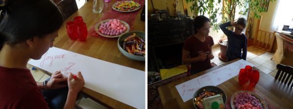 Les invités étaient ponctuels et déjà excités à l’arrivée. Clémentine a tout de suite demandé si on allait encore jouer à la pomme. Vous ne connaissez pas le jeu de la pomme ? Cliquez ici. Il y a deux ans, c’était Clémentine qui l’avait emporté haut la main. Mais pour commencer, Enzo a tenu à chanter avec tout le monde « Paulo » de Stromae. J’ai mis le son sur mon PC et hop, la chorale s’en est donnée à cœur joie : « Paulo aime les moules frites, sans frites et sans mayo« .