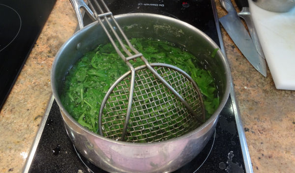 Couper en biais la base de chaque courgette (c’est plus joli). Dans une casserole d’eau bouillante, plonger les fleurs de courgettes en laissant une minute la partie « courgette » dans l’eau (la fleur flotte) puis en enfonçant les fleurs avec une grille sous l’eau pendant quelques minutes.