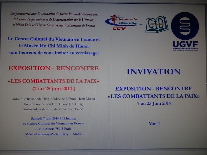En partenariat avec l’Association d’Amitié Franco-Vietnamienne, le CID Vietnam, le Nhân Dân et l’Union Générale des Vietnamiens de France, le Centre Culturel du Vietnam en France et le Musée Ho Chi Minh de Hanoi ont le plaisir de vous inviter à l’exposition – rencontre : « LES COMBATTANTS DE LA PAIX » (7 au 25 juin 2014 ).