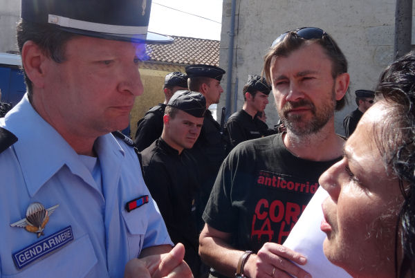 Une premier menace d’être chargés par les gendarmes est annoncée par les deux sommations légales demandant de nous disperser. Nous nous asseyons tous par terre et les flics réalisent assez vite qu’il va être difficile et long de nous faire bouger. De longues tractations s’engagent entre le colonel de gendarmerie et Jean-Pierre Garrigues soutenu par Carole Saldain, déléguée du CRAC Europe mais aussi ancienne attachée parlementaire qui maîtrise son Droit sur le bout des doigts. Nous acceptons de faire reculer le camion de 50 mètres.