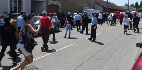 L’un des militants est poussé violemment contre un mur et se retrouve la tête en sang. Un des gendarmes lui dit qu’ils ont un « dossier » sur lui et que s’il ne part pas immédiatement, ils le coffreront. Totalement bidon : soit ce militant est recherché par la police et il aurait été arrêté, soit le « dossier » ne justifie rien de tel et ils n’ont aucun motif pour l’embarquer. Mais cela, le militant ne le sait pas et préfère quitter la manif avec plusieurs autres qui l’accompagnent. Au passage, à chaque fois que des manifestants quittaient nos rangs en petits groupes dans la journée pour aller se procurer de l’eau, les gendarmes leur interdisaient de revenir. Nos troupes sont ainsi passées graduellement de 160 à une soixantaine.