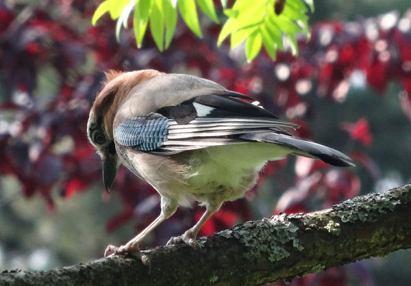 Le geai est magnifique et il vit en couple dans le jardin. Cet oiseau est habituellement difficile à prendre en photo car il se planque souvent dans les sapins de la forêt, sur les branches les plus hautes et se confond avec le feuillage.