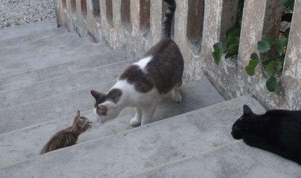Une différence notable, observée souvent chez nous, est que l’instinct maternel semble être remplacé par l’instinct paternel : les chattes adultes n’expriment aucune attirance pour les chatons que nous recueillons alors que plusieurs des chats mâles se sentent investis d’une responsabilité de protection et de gestes câlins pour les petits. C’est ainsi que Charlot a veillé sur l’enfance de Lulu et de Djinette, alors que Paco fond de tendresse pour les bébés du moment.