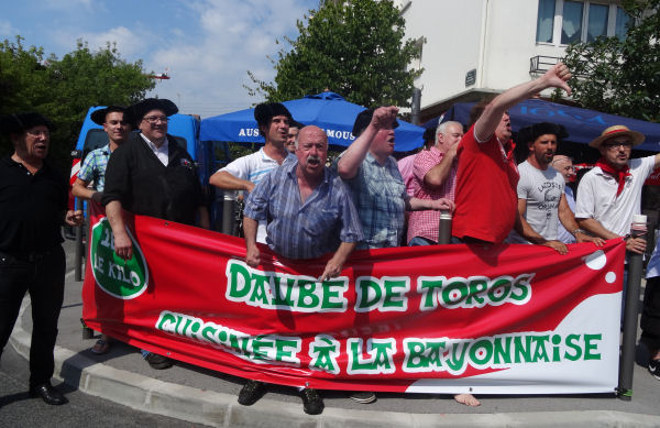 Dans l’après-midi, plusieurs centaines de manifestants se sont rassemblés place de la Mairie et ont déambulé dans la ville pour informer non seulement les Bayonnais mais également les touristes sur ces différents thèmes. En dehors de quelques incidents mineurs avec des aficionados très agressifs et visiblement ivres, la manifestation s’est parfaitement déroulée avec un point d’arrivée à quelques centaines de mètres des arènes où un cordon de CRS empêchait le cortège de se rapprocher plus.