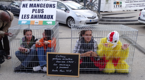 Le mercredi, nous avions un autre rendez-vous boulot très agréable près de la gare de Lyon (sans rapport avec la PA, celui-là), à la suite duquel nous avons croisé un groupe de militants de L214, certainement l’une des associations les plus respectées pour leur travail admirable de sensibilisation auprès du grand public au sort des animaux d’élevage. Nous avons passé un bon moment avec eux à parler des sujets du moment. Anti a pris place dans l’une des cages où ils conviaient les passants à s’installer quelques minutes pour avoir une idée de ce que ressentent les animaux d’élevage contraints d’y passer leur vie.