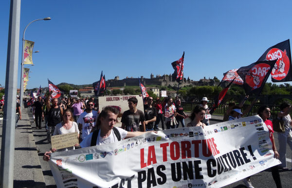 Notre manifestation anticorrida à Carcassonne d’hier s’est passée sans aucun incident : les aficionados étaient invisibles (il faut dire que dans cette ville, ils sont une toute petite minorité) et les forces de l’ordre d’une courtoisie parfaite avec nous (nous les en remercions sincèrement). Je reviendrai dans les prochaines heures sur les détails de la journée, avec de nombreuses photos. Pour ce matin, juste deux images.