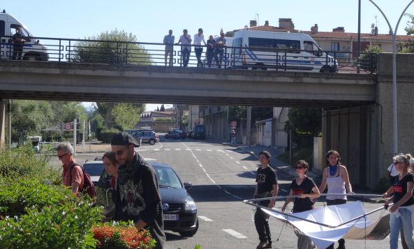 Et lorsque nous sommes arrivés devant le barrage de CRS (qui, au passage, nous retenait plus loin que ce que l’arrêté du maire avait annoncé… mais on a l’habitude), nous les avons laissés là avec leurs barrières anti-émeute et nous sommes descendus sur la berge de l’Aude pour être au plus près des arènes qui se dressaient de l’autre côté. Tout cela sous le regard parfaitement serein des forces de l’ordre restées sur le pont. Normal : nous ne faisions rien de mal, ils n’avaient donc aucune raison de nous charger.
