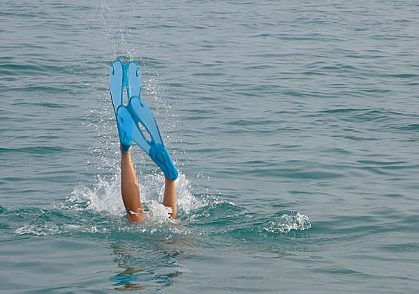 Et plouf, la voilà partie. J’ai pu prendre une photo du moment émouvant où la célèbre baleine bleue s’enfonce dans les profondeurs mystérieuses de… euh… je veux dire, où la ravissante sirène aux palmes bleues s’enfonce d’un mètre sous la surface avant d’atteindre le fond.